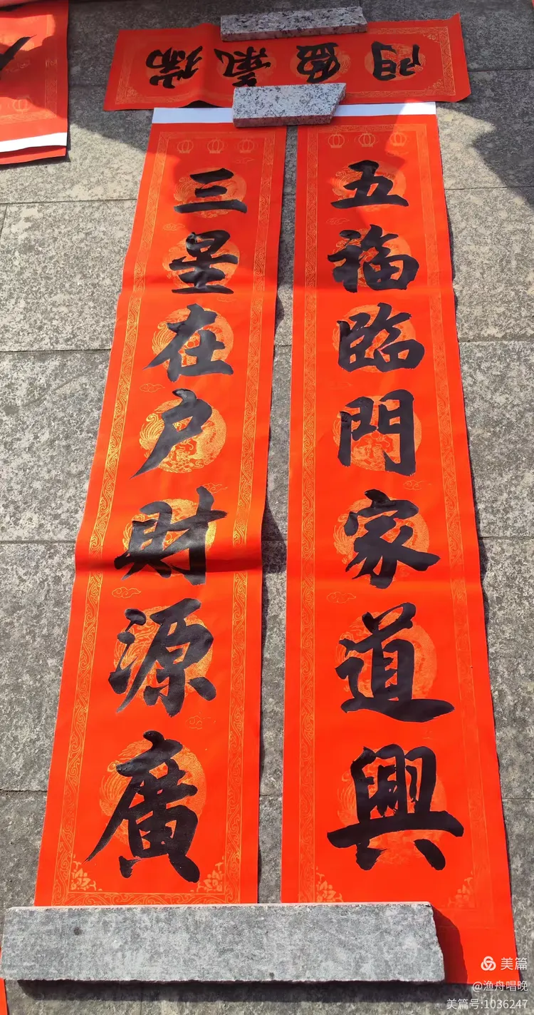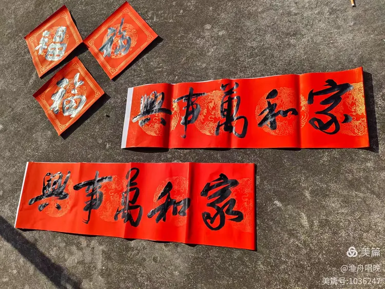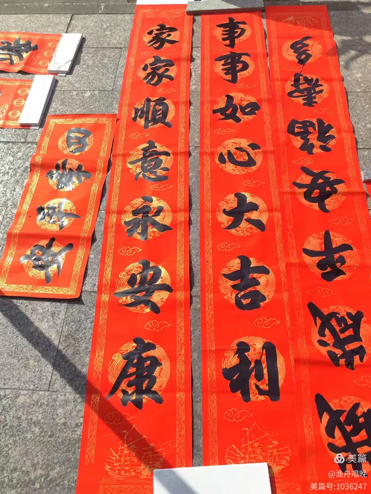 分处两个社区(村)的书法家们挥毫泼墨,整整忙乎了一上午,共为居民免费书写并送上1000张“福”字和1200套春联,居民们兴高采烈地拿上社区准备的红纸,待书法家们写好后,晾干墨迹,捧着珍贵的节日礼物,高高兴兴回家去。有些人领了好几套,回去送亲朋好友。